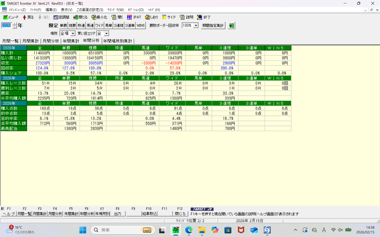 2月購入 26500円 回収 35700円 収支 +9200円 回収率 134.7% 的中率 15.0% 3/20R